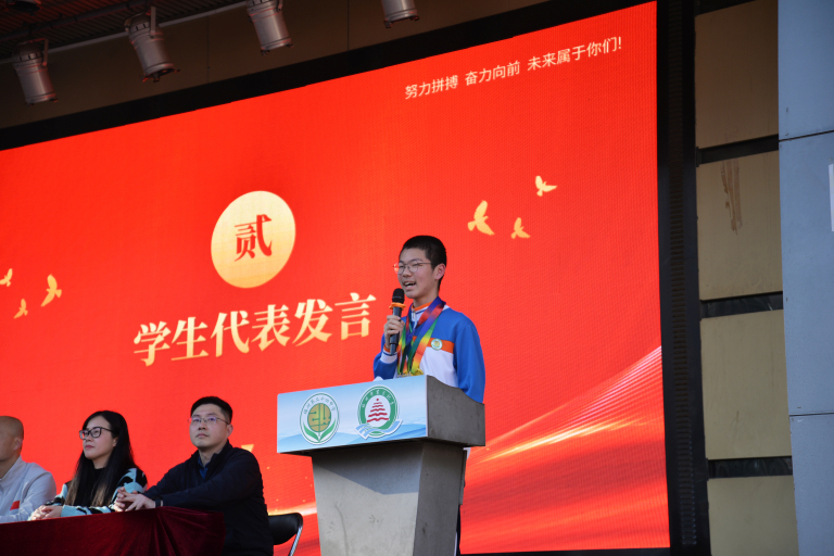 接着,教师代表杨琤发言,她回顾肯定了学子们的付出,鼓励学子们直面挑战,调整心态,全力以赴。同时,她也给出了老师们的承诺:老师始终都会与学子们并肩作战,以笔尖为剑,以知识为盾,为朝梦想奋斗的同学们保驾护航。