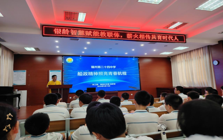 银龄智慧赋能教联体,薪火相传共育时代人。9月16日下午福州二十四中德育处邀请校关工委常务副主任、离退休支部组织委员吴宏奋老师为初二年段部分学生做“船政精神照亮青春航程”的专题讲座,活动由德育处副主任周逸鸥老师主持,初二年段段长朱晖老师和部分班主任出席了讲座活动。