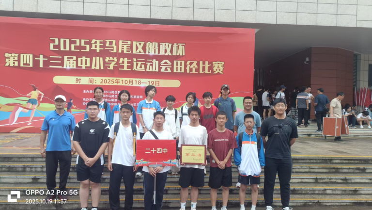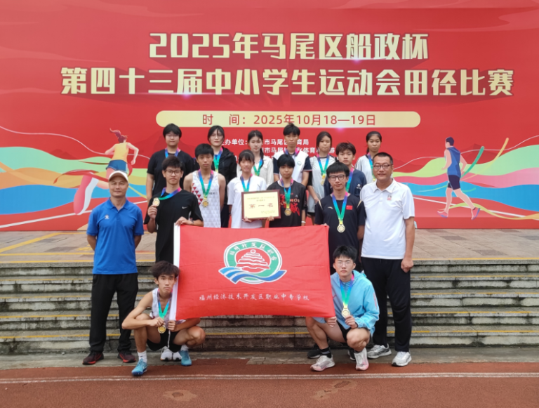 2025年10月18-19日,马尾区“船政杯”第43届中小学生田径运动会盛大开赛。我校初中、职专田径队凭借过硬实力与顽强斗志奋勇拼搏,最终斩获高中组团体总分第一名、初中组团体总分第三名的优异成绩,在赛场上书写了属于我校的体育荣光。