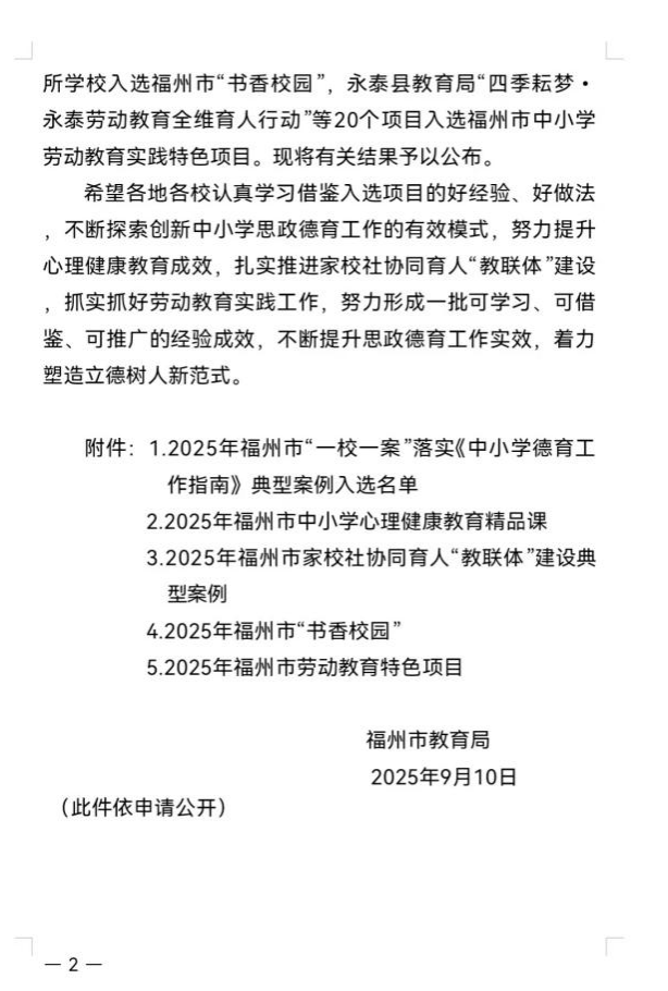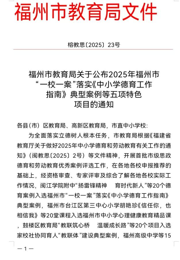 近日,福州市教育局公布2025年五项特色项目评选结果,福州第二十四中学“建立‘生命成长’教联体奏响‘协同润心’大合唱”项目,成功入选福州市家校社协同育人“教联体”建设典型案例。