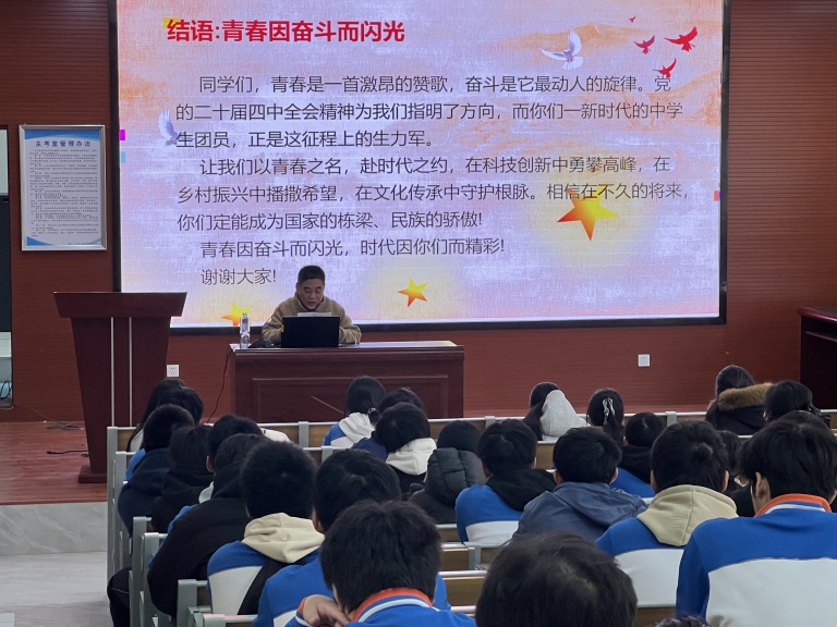 此次辅导报告在热烈的掌声中结束。通过这次学习,职专部团员青年们对党的二十届四中全会精神有了更深刻的认识和理解,进一步增强了政治责任感和历史使命感,将以更加饱满的热情和更加昂扬的斗志投入到学习和生活中。以青春之名,赴时代之约。为实现中华民族伟大复兴“中国梦”,书写属于自己的青春华章。