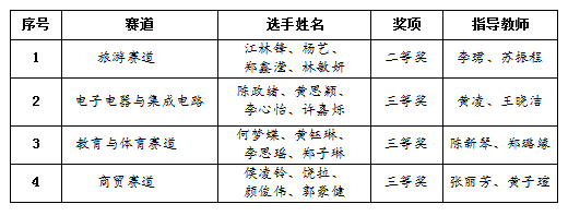 旅游赛道江林锋、杨艺、郑鑫滢、林敏妍组成的团队表现优异,荣获市赛二等奖并晋级省赛;在电子电器与集成电路、教育与体育、商贸三个赛道中,陈政绪等团队均凭借扎实的技能和稳定的发挥,荣获市赛三等奖。