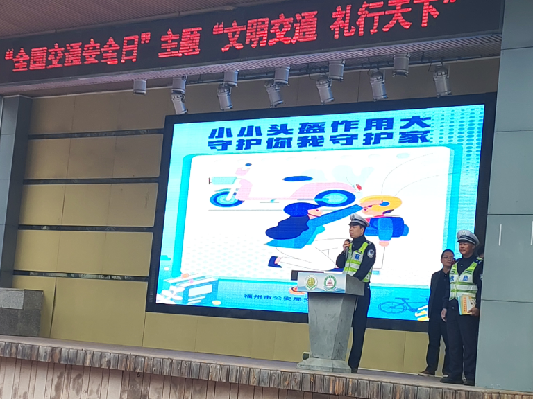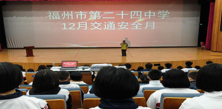 2025年12月15日上午,伴随着雄壮的国歌声,福州二十四中、开发区职专全体师生齐聚操场,一场特别的“国旗下讲话”正在举行。马尾区交警大队熊超警官应邀入校,为师生带来了一场主题为“文明交通,礼行天下”的生动宣讲,也为我校为期一个月的交通安全宣传月活动画上了浓墨重彩的句号。