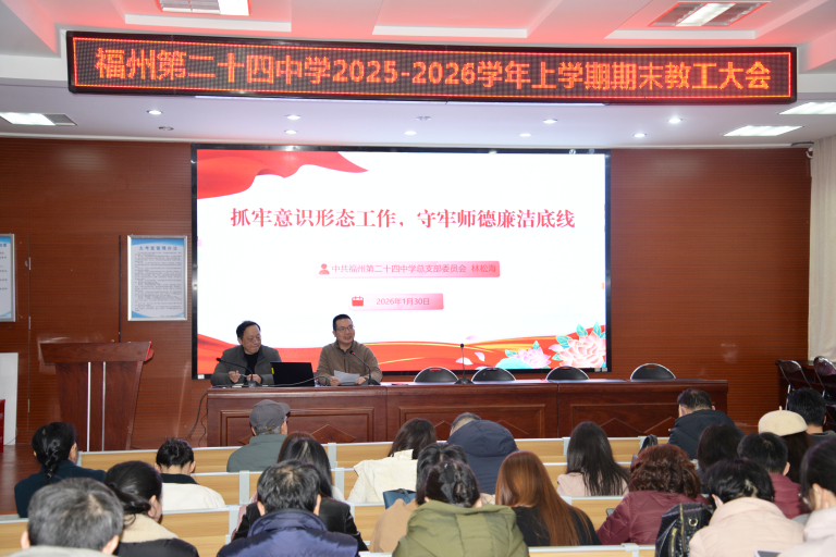 为持续巩固学校意识形态阵地,深化师德师风与廉洁从教建设,2026年1月30日,中共福州第二十四中学总支部纪检委员、副校长林松海同志面向全体党员及教师,讲授了一堂深刻且生动的专题党课——《抓牢意识形态工作,守牢师德廉洁底线》。党课紧密联系实际,引述诸多具体案例,深入浅出,引发了在场教师的深切共鸣与思考。