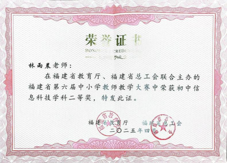 我校信息科技学科林雨晨老师凭借扎实的教学功底、精湛的教学技艺和稳定的赛场发挥,从众多选手中脱颖而出,荣获 “福建省第六届中小学教师教学大赛初中信息科技学科二等奖”。这一荣誉不仅展现了教师个人卓越的专业素养,也充分展示了我校青年教师过硬的教学技能与风采。