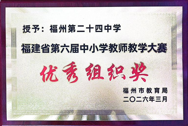 福州市教育局对在此次大赛中组织工作突出、教师培养成效显著的学校进行了集中表彰。鉴于我校在备赛过程中高度重视、周密部署,为参赛教师提供了坚实的后勤保障与专业的教研支持,福州市教育局特授予我校 “福建省第六届中小学教师教学大赛优秀组织奖” 。这份沉甸甸的集体荣誉,是对学校长期以来重视师资队伍建设、深耕教学质量的最高褒奖。
