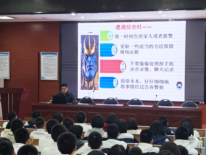 讲座伊始,吴宏奋老师以亲切的问候拉近了与学生的距离。结合初中生的身心发展特点,他用通俗易懂的语言,从“认识身体边界”“辨别侵害行为”“应对校园欺凌”三个方面展开讲解。在讲解身体边界时,吴老师通过生动的案例,引导学生清晰认识自己的身体隐私部位,明确“哪些触碰是安全的,哪些是需要坚决拒绝的”,帮助学生建立起自我保护的第一道防线。