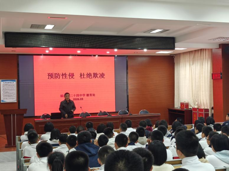 为进一步增强初一学生的自我保护意识,预防性侵、杜绝校园欺凌,2026年3月17日下午,福州二十四中特邀学校关工委常务副主任、离退休支部组织委员吴宏奋老师,为初一年段全体学生带来了一场主题为“安好青春‘防护墙’”的专题讲座。