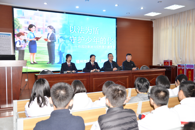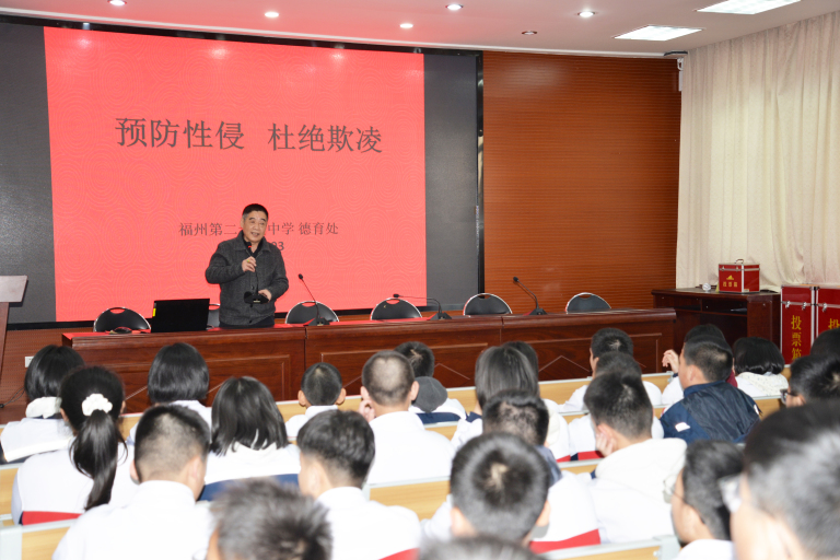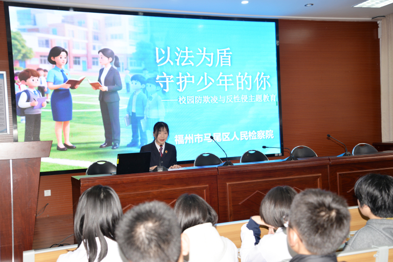 为进一步加强校园安全管理,筑牢校园反欺凌防线,提升学生的法治意识与自我保护能力,守护未成年人健康成长,我校开展了“反欺凌防侵害”专题系列讲座,特邀福州第二十四中学法制副校长、马尾区检察院林瑜检察官,马尾区检察院杨颖检察官助理,校关工委副主任、离退休支部支委吴宏奋老师莅临授课,与会人员有副校长林松海、德育处副主任谢沅波及七年级师生。