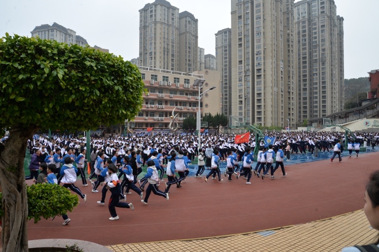 伴随着大课间铃声响起,家长们移步操场观摩阳光体育活动。初一、初二年级进行广播操展示,同学们动作舒展、精神饱满,在律动中彰显青春的朝气与活力;初三学子则迈着铿锵有力的步伐展开跑操,队列整齐、口号嘹亮,展现出冲刺中考的昂扬斗志。家长们纷纷举起手机记录精彩瞬间,为孩子们阳光向上的精神面貌点赞。