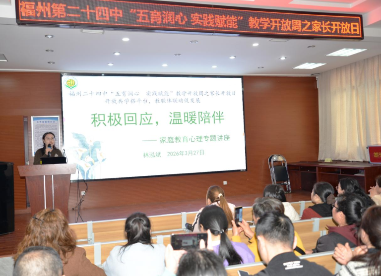 为助力家长读懂青春期孩子的心理变化,构建科学家庭教育模式与和谐亲子关系,2026年3月27日家长开放日期间,心理教师林泓斌面向全体家长开展“积极回应,温暖陪伴”家庭教育指导讲座,重点科普了青春期孩子的大脑发展特点,详细讲解家长与青春期孩子沟通的技巧、注意事项,引导家长树立科学的教育理念,学会倾听孩子、理解孩子,搭建和谐的亲子关系。这场讲座进一步凝聚了家校育人合力,为学生心理健康成长筑牢家庭防线。