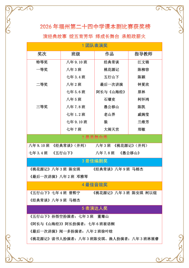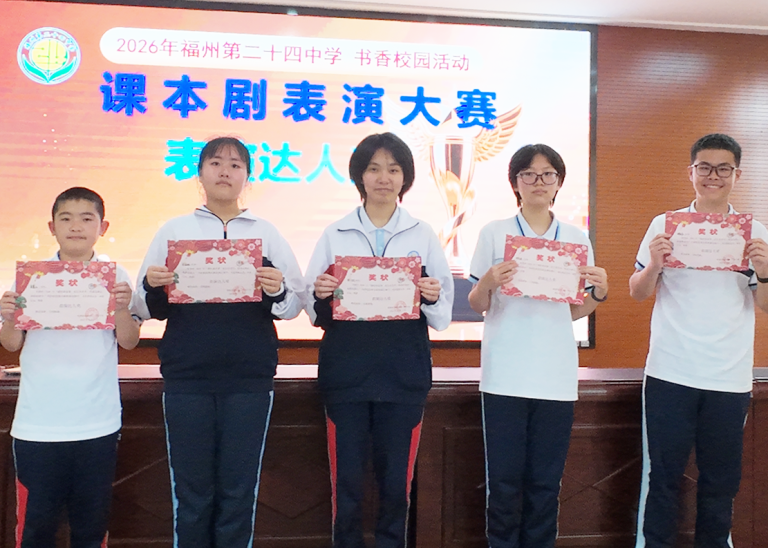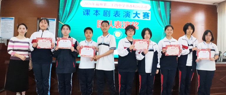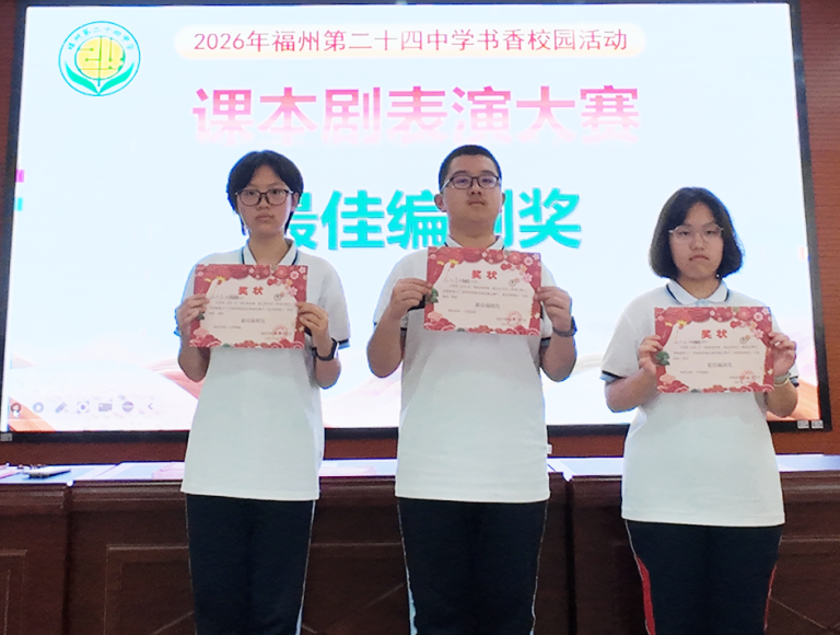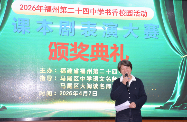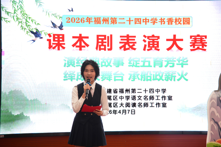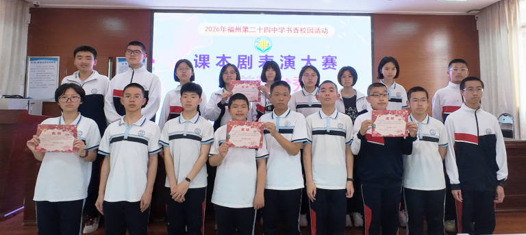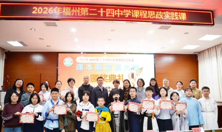 本次2026年“演经典故事,绽五育芳华;绎成长舞台,承船政薪火”课本剧比赛,以课本剧为载体,融合经典研读、思政教育与五育培养,通过“听说读写演评”全流程实践,厚植校园文化、提升学子能力、传承优秀文化与船政精神。从七年级青涩真诚到八年级从容绽放,每一次参与都是书香校园建设的生动实践。福州第二十四中学将以此为契机,深耕课程思政,丰富校园活动、搭建成长舞台,让经典浸润心灵、船政薪火相传,助力少年向阳生长。
