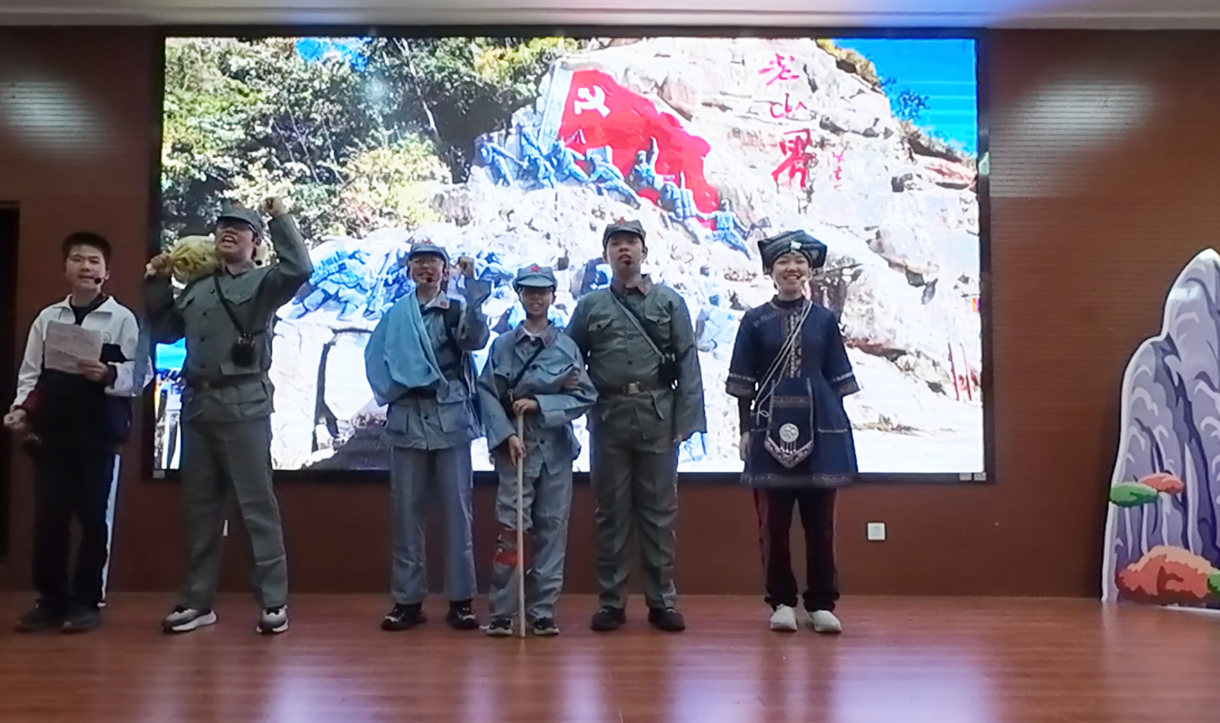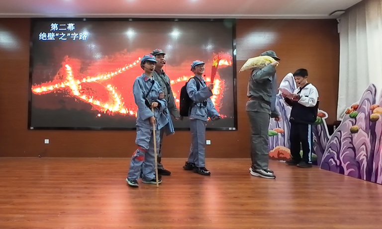 七年 1 班、2 班同学倾情演绎《老山界》,以青涩却赤诚的表演再现红军长征中的坚守与担当,让观众感受革命先辈的坚韧意志,接受深刻红色教育。