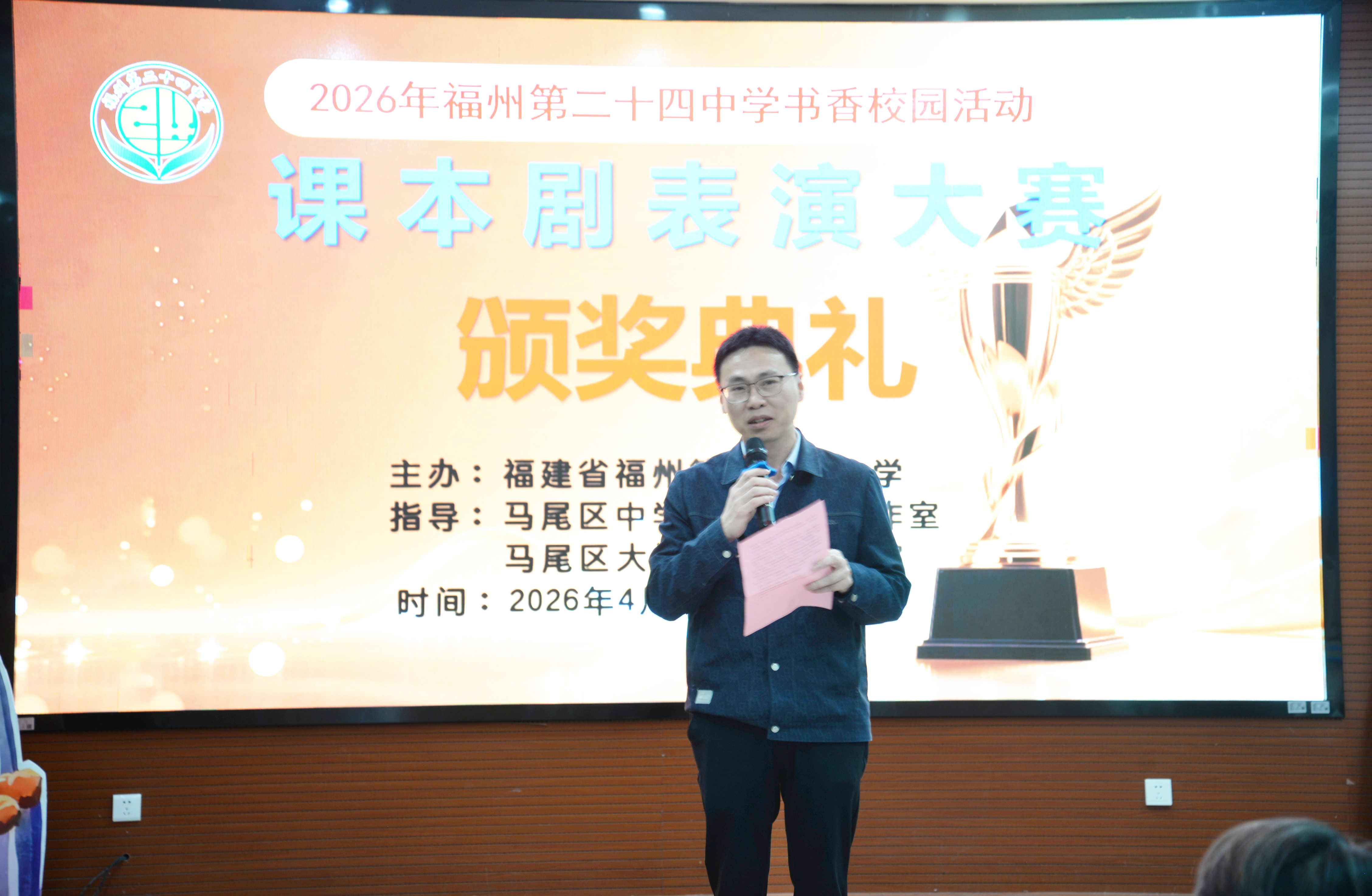 本次课本剧表演大赛由马尾区中学语文名师工作室、马尾区大阅读名师工作室指导,福州第二十四中学主办。校长张统焰、校总支书记胡克晶、副校长林松海、校长助理谢金山等学校领导及校内相关部门负责人,马尾区教师进修学校正校级督导吴东芳、中学语文教研员苏瑞英、福州市和平中心小学校总支书记朱月霞,兄弟校教师、家长代表及教师代表莅临现场观赛。